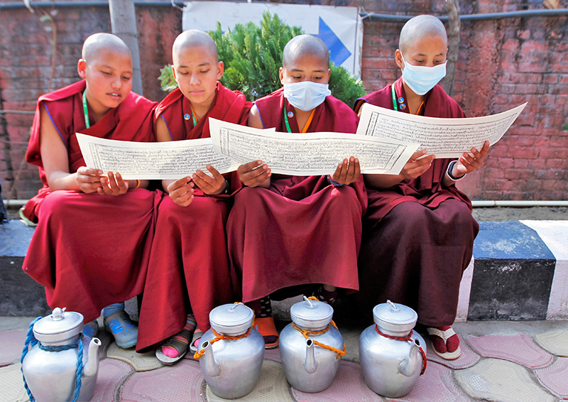 11. 協助司茶的小沙彌尼們,也把茶壺先放一邊,各分了幾頁,坐在會場旁的花園區,共襄盛舉。