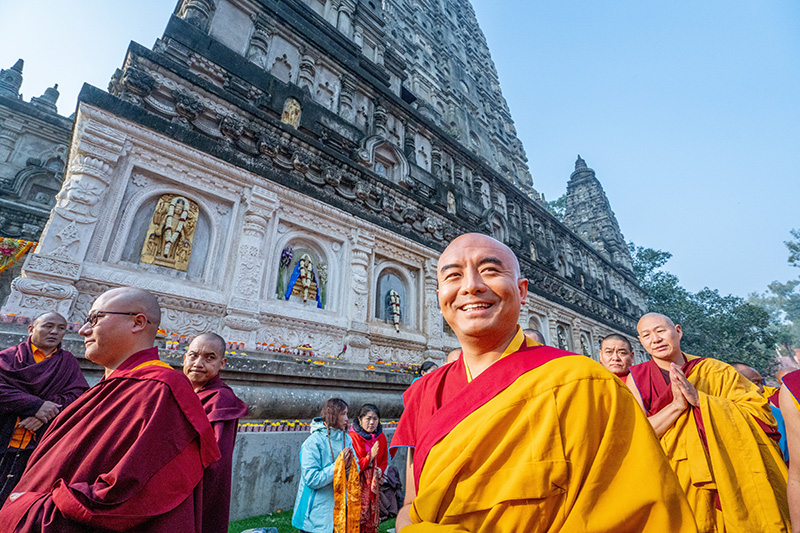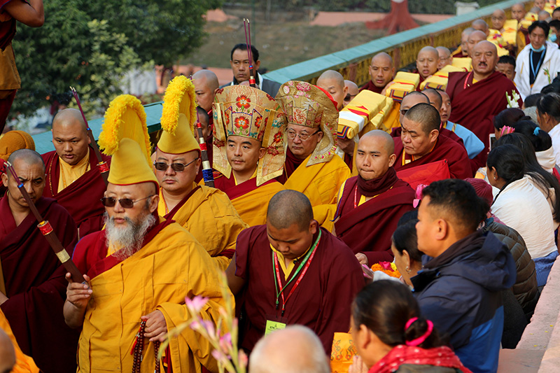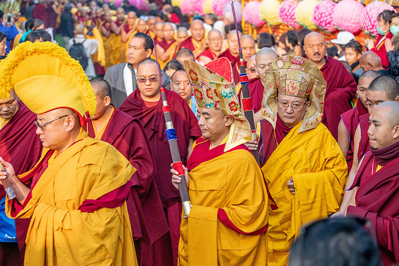 4. 在持香師及竹奔仁波切等祖古陪同下,明就仁波切、嘉察仁波切依序先右繞佛塔一圈,與菩提樹旁的110位比丘及比丘尼們會合後,步上階梯來到正覺大塔的最外圈,開始第36屆噶舉祈願法會的扛經繞塔活動。