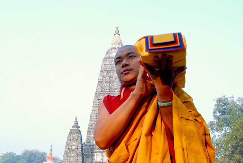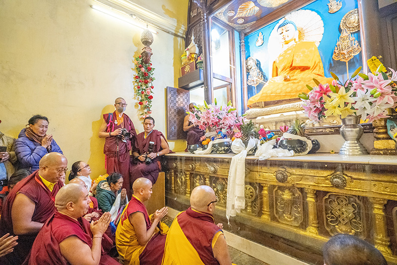 3. 嘉察仁波切及明就仁波切帶領祈願法會主辦僧眾團隊,共同於金色身世尊前獻上佛衣、供養,並念誦祈願佛教興盛、世界和平的系列祈請文、禮讚文和祈願文。