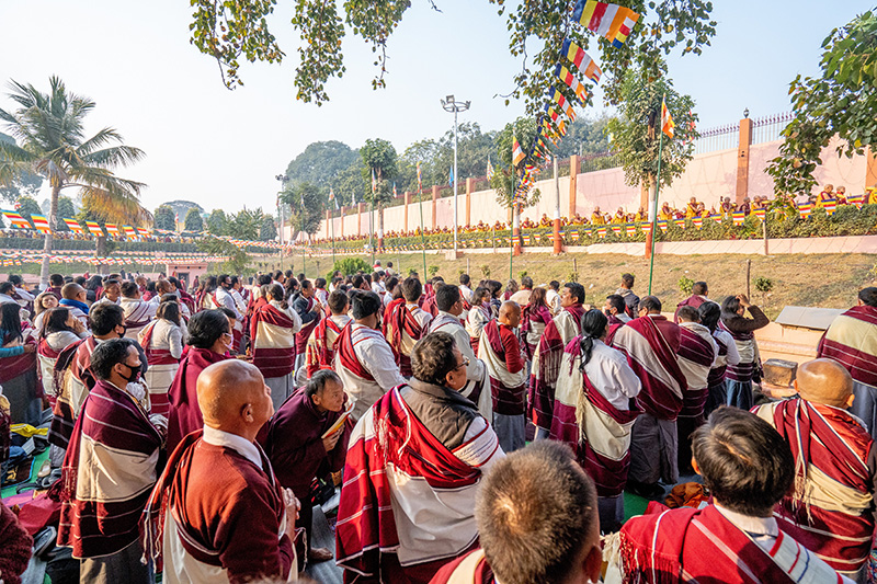1. 1月16日清晨6點前後,甘珠爾大藏經貝葉經被載運至菩提迦耶正覺大塔,放置於相傳是佛陀悟道、實則是多年前重新栽種的菩提樹旁桌上,晨曦薄霧中等待觀禮的民眾,欣喜的以頭頂禮或以手中蓮花向大藏經致敬。