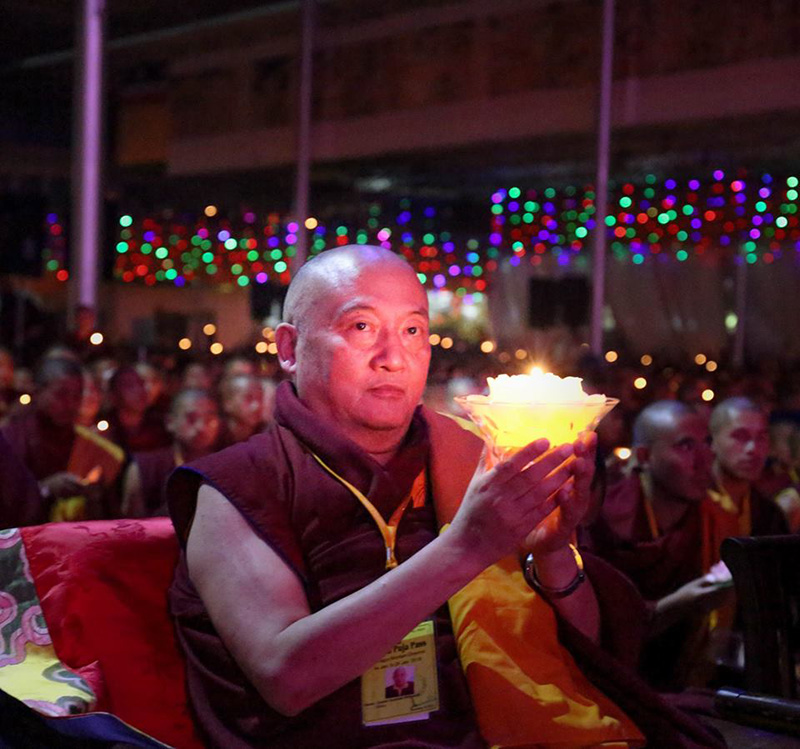 13. 嘉察仁波切手持寶蓮燭台,以溫暖橘光,與會眾的點點燭火,融匯為祈願之光流。
