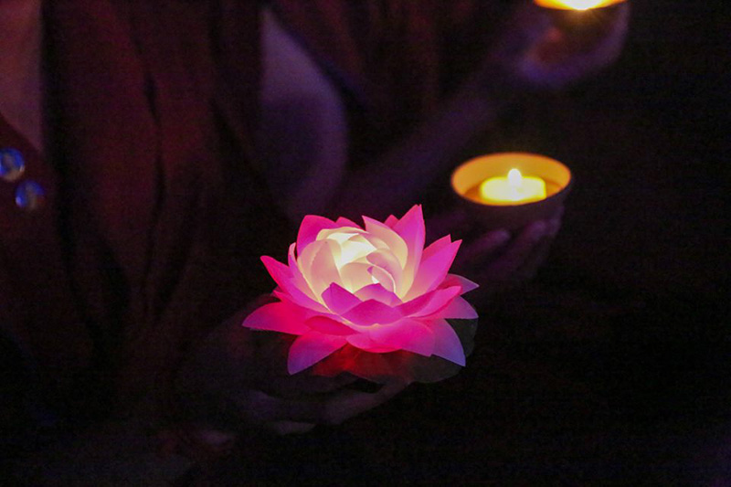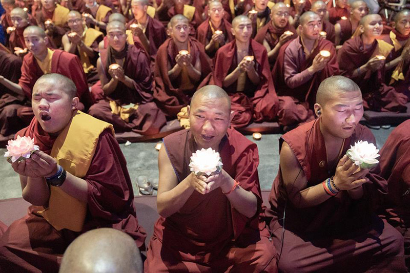15. 搖曳燈海中,大眾同聲祈願:「願此燈之數,億盞得現於每尊佛前,願此光明,消除三有頂以下、無間地獄以上,所有無明之黑暗,願十方諸佛菩薩之淨土,皆得顯明親見。」