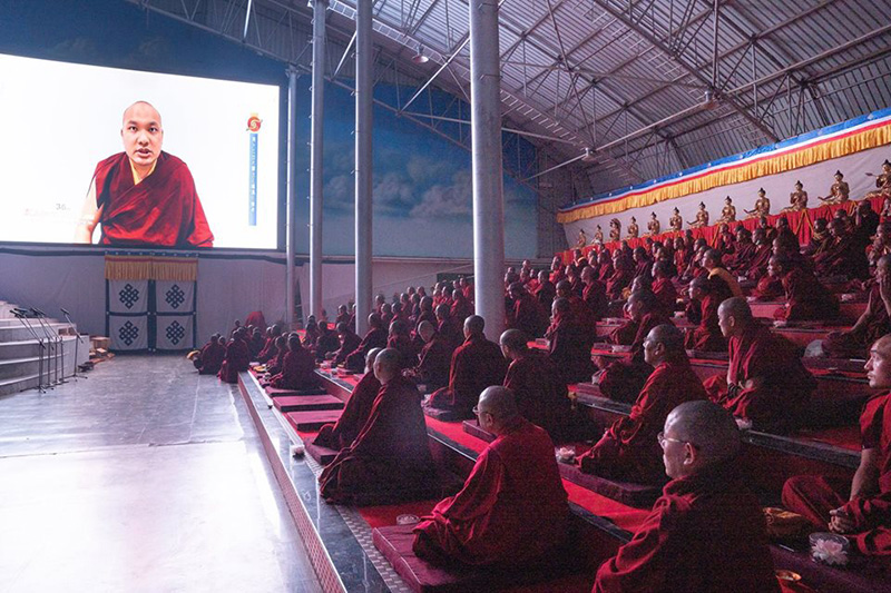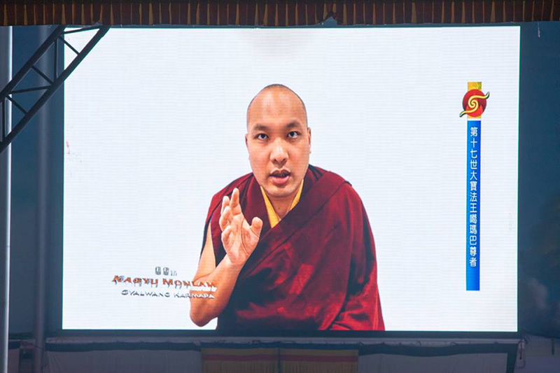 2. 印度時間晚間7:30,目前在美國弘法的法王噶瑪巴,以錄影方式,對數千位僧眾暨來自各國的法友,做了一段半個多鐘頭的特別開示:「首先問候第36屆噶舉大祈願法會的主法上師國師嘉察仁波切,以及以怙主明就多傑仁波切為主的法會大眾們,諸位堪布和善知識們,來自不同噶舉寺院的僧尼大眾,以及來自世界各地的具信大眾們致意,願各位吉祥如意。」