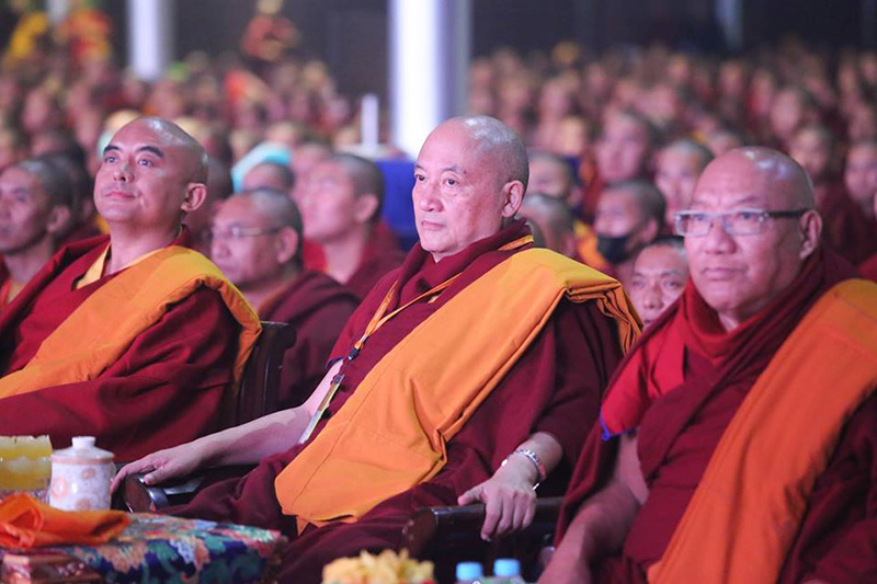 3. 在舞台區前方第一排座位上,以國師嘉察仁波切為首的法王子們,聚精會神聆聽舞台上大螢幕播放的法王開示。