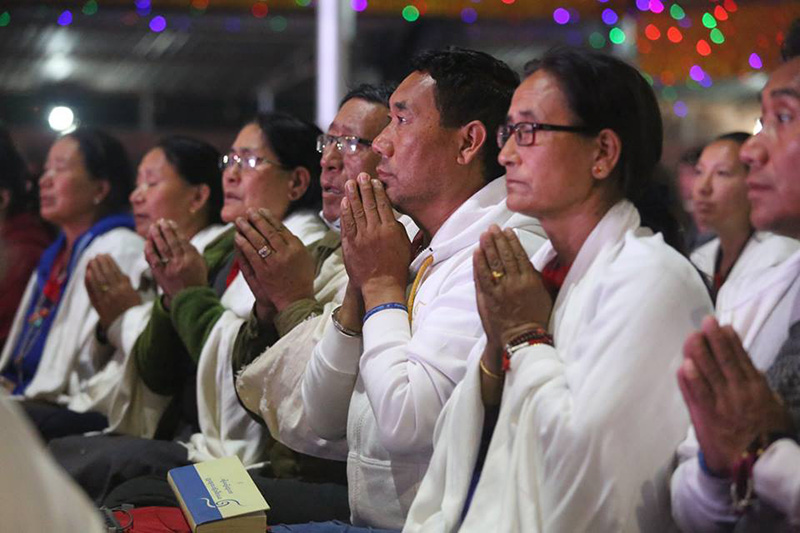 6. 此次祈願法會最大法友團:來自尼泊爾涅香地區的3百位功德主團,當晚也由20位婦女主動供養唱頌節目,他們在舞台左側的登台預備區等候,在看到法王影像後,立刻改為低跪姿,合掌恭敬聽取開示。